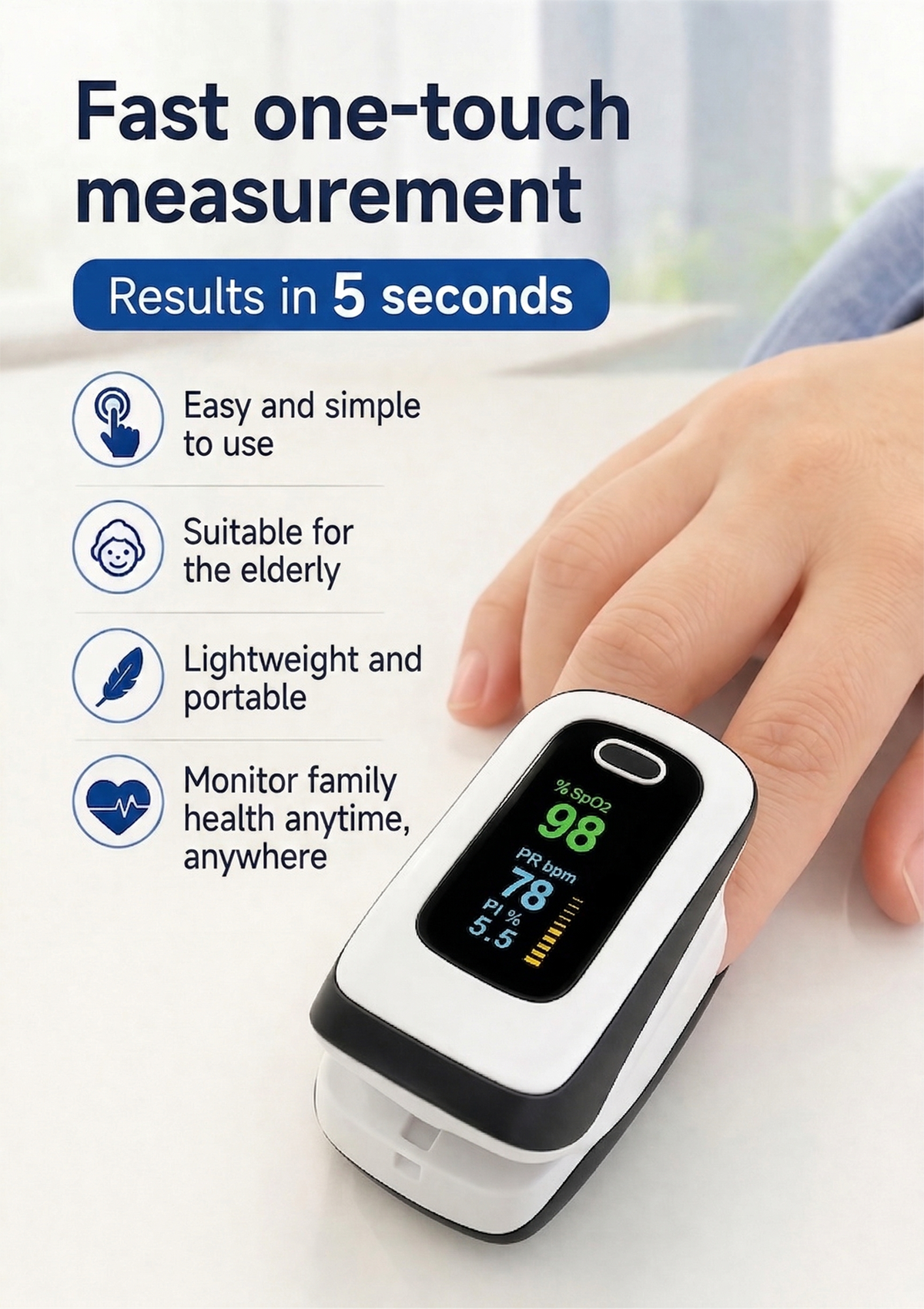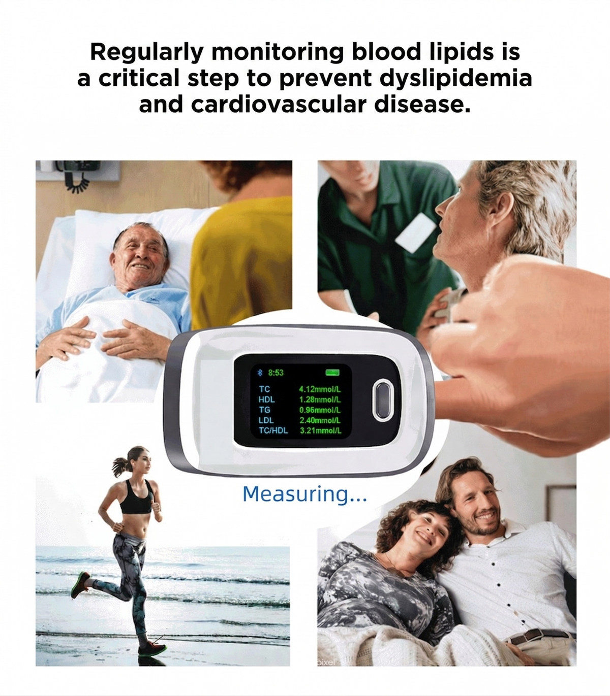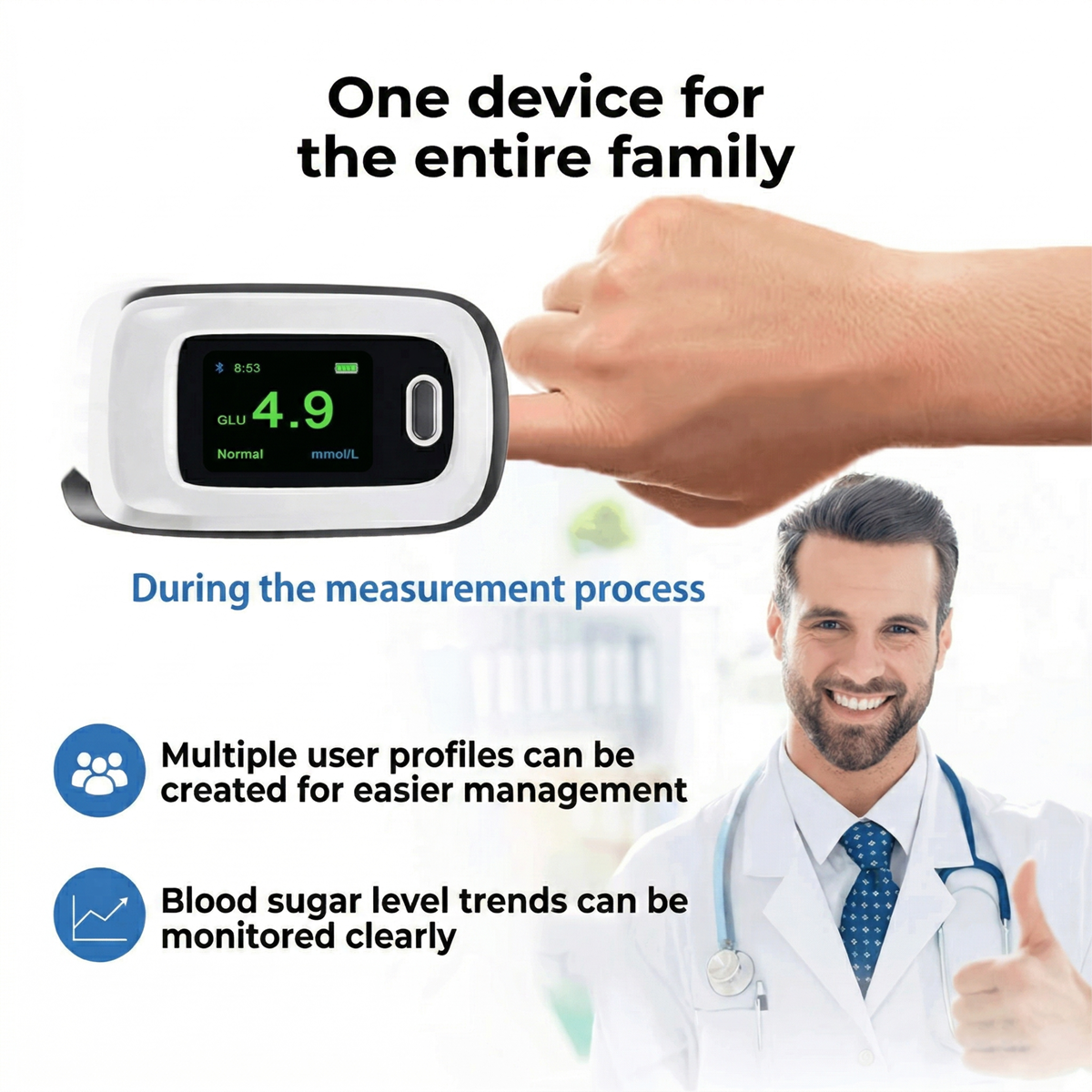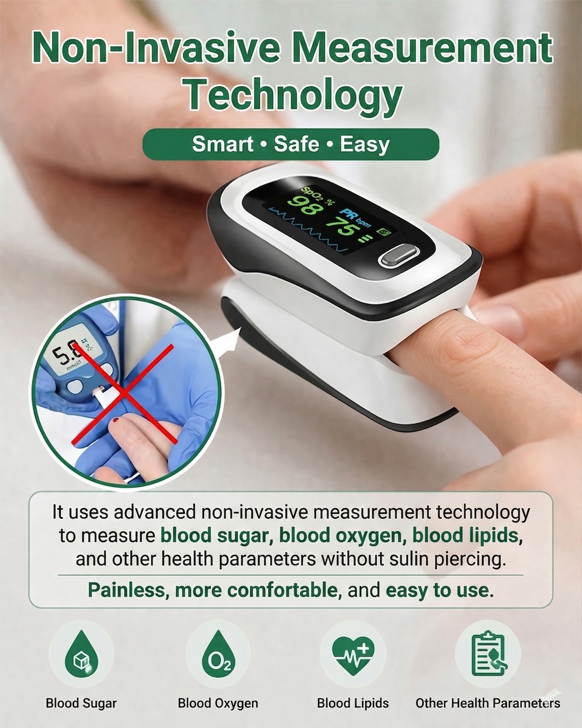 Unique and non-invasive measurement technology, no blood sampling required, non-invasive and painless, more convenient and easy to use.