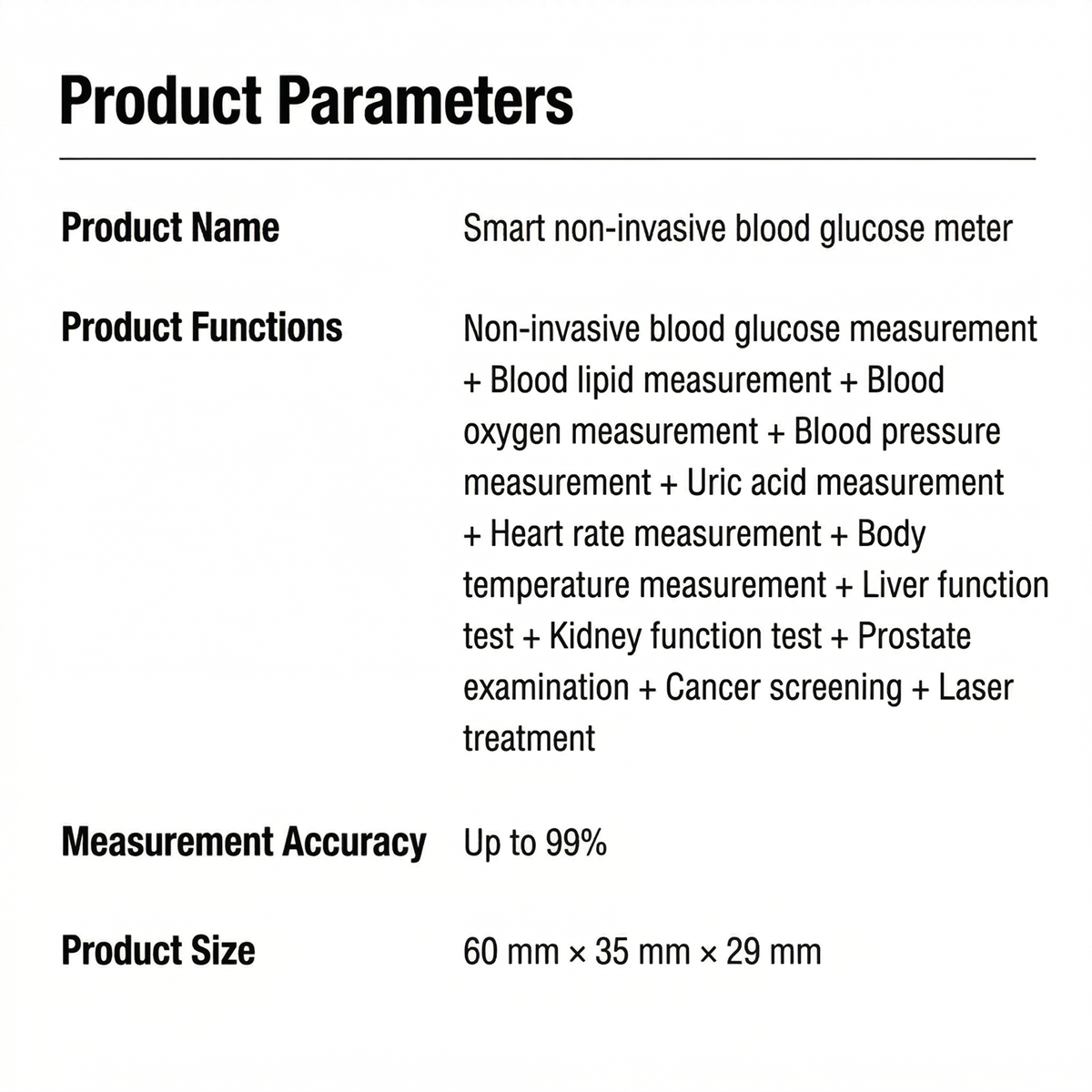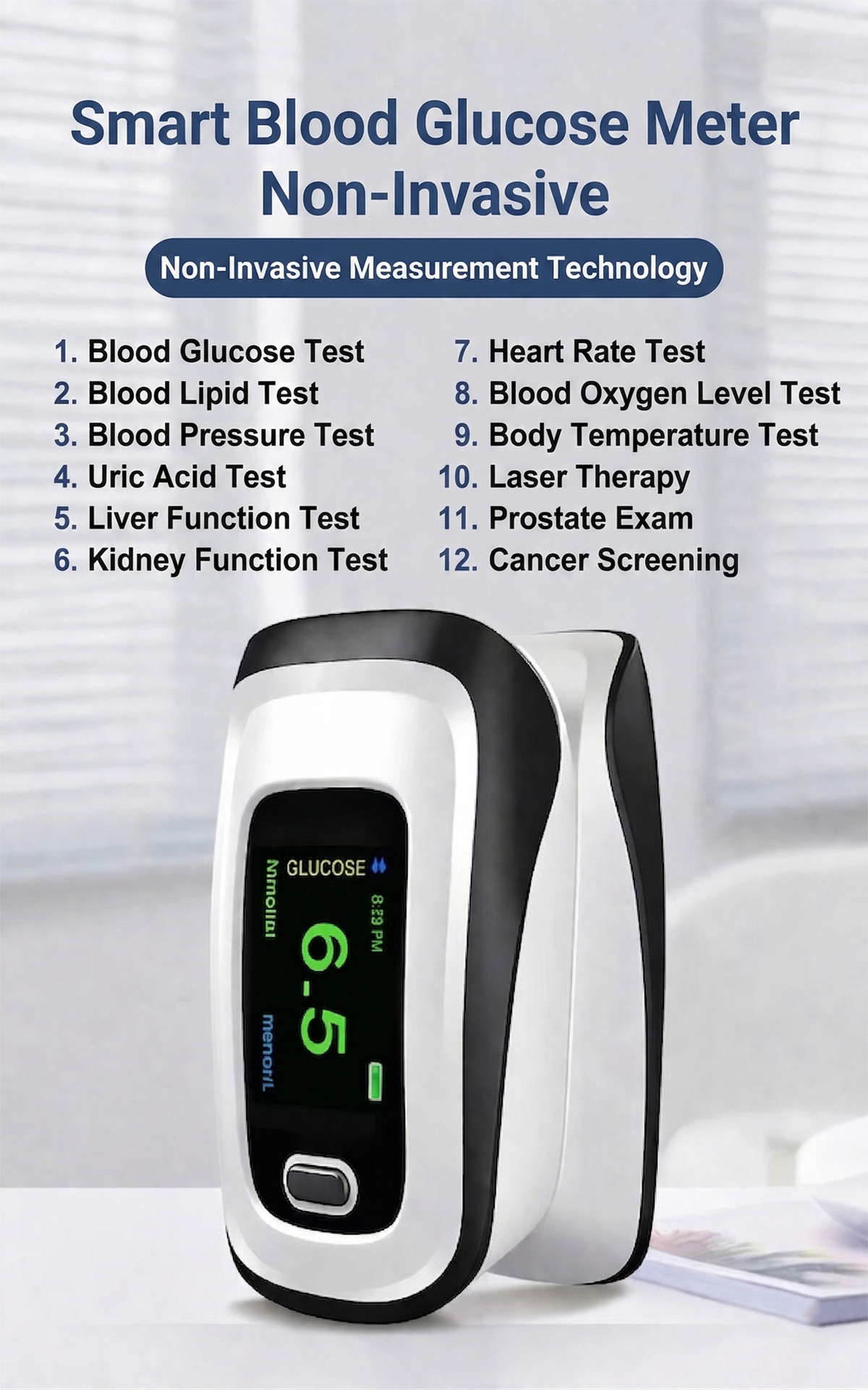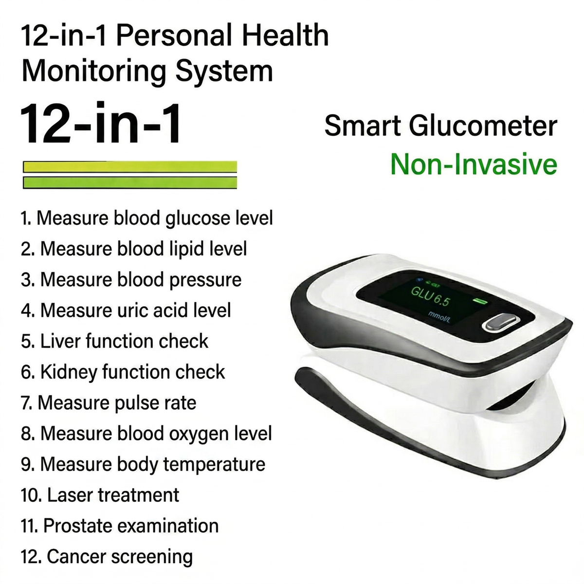To help more people prevent diabetes, our company has spent five years developing this multifunctional, non-invasive 12-in-1 blood glucose meter. To give back to the community at the initial launch of this product, we are offering pre-sales at a very low price. Limited to one unit per person. This promotion ends at the end of this month, so please order now.